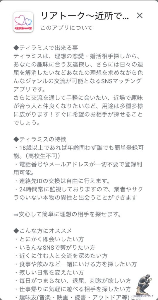 - 年齢認証なし・届出なし・出会い目的の利用禁止で、安全面に不安が残る